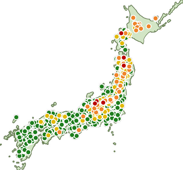 🟢まだ 🟡色づき 🟠見頃 🔴落葉始め 🟤落葉